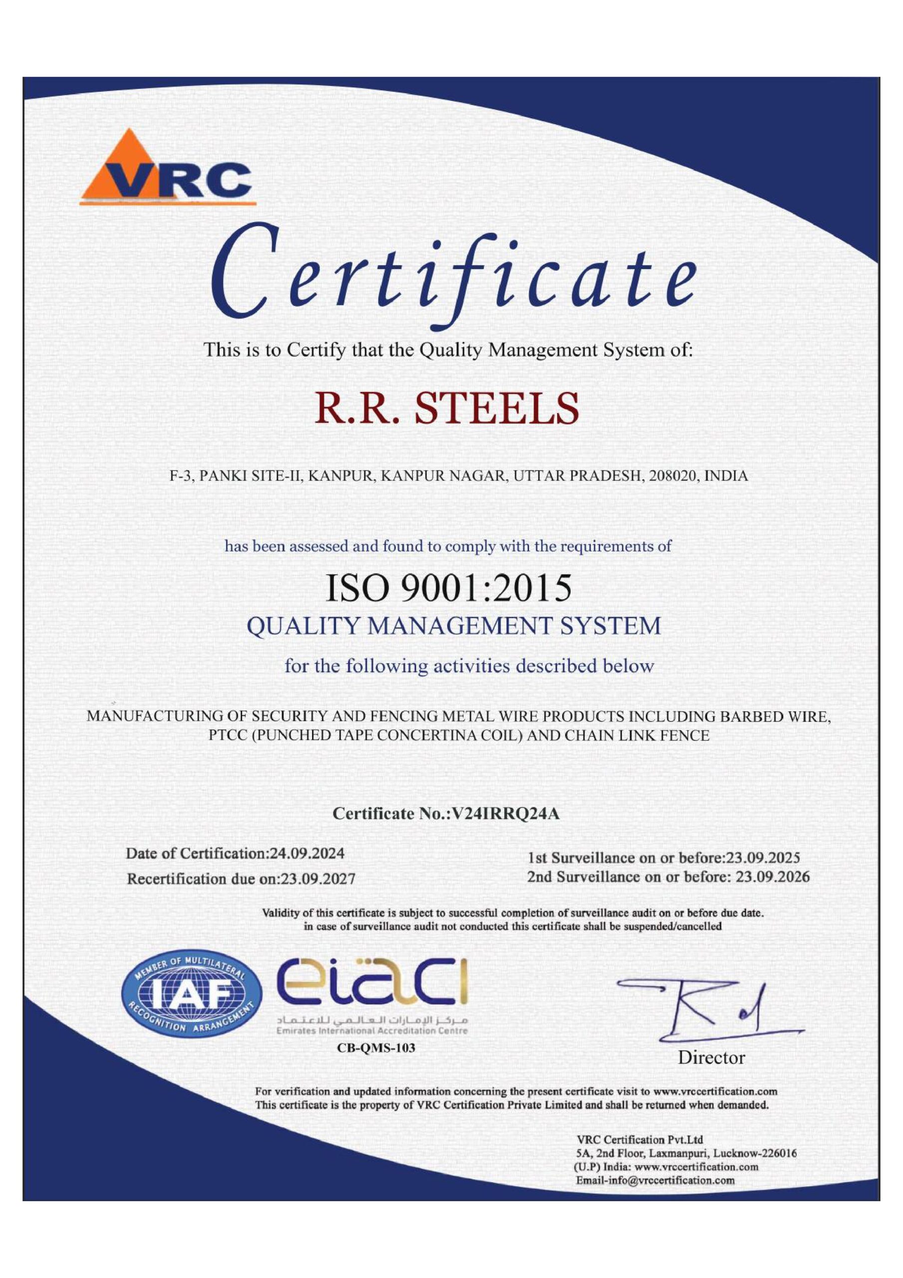 We have numerous certifications and approvals which cement our products quality and reach. We are an ISO 9001:2015 certified company, and we hold IS278 license for barbed wires as well. We are a registered brand with trademark pending for our brand logo and name ‘RRS Security First’. We are also GeM approved OEMs for all of our products, showcasing our expertise in the field. By working with us, you can be assured that your needs will be well taken care of.